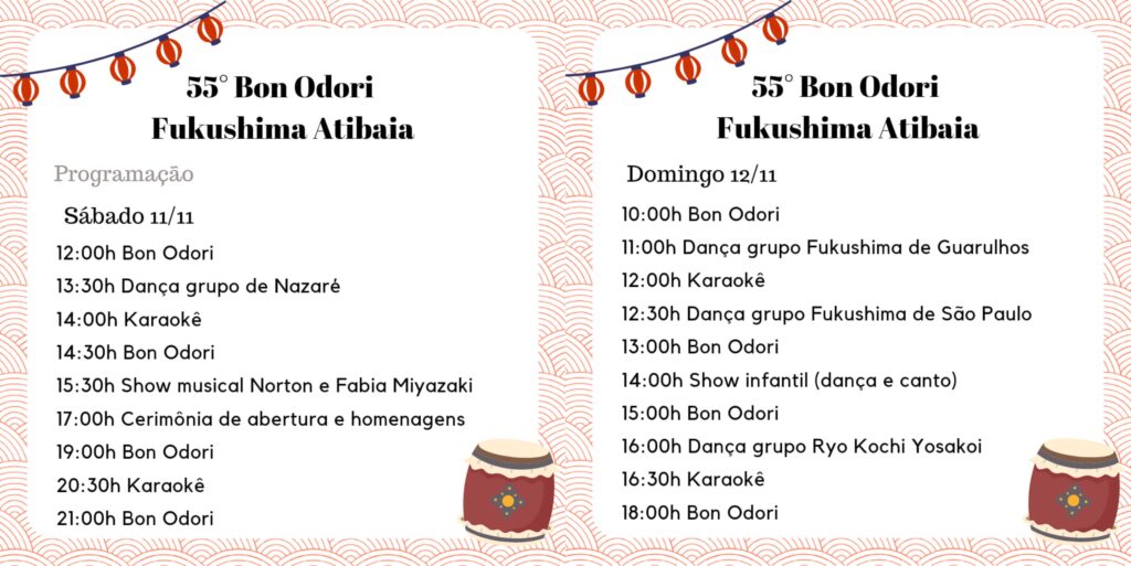 No sábado, as apresentações de Bon Odori acontecerão às 12h, às 14h30h e às 21h, e no domingo, serão às 10h, às 13h, 15h e às 18h.