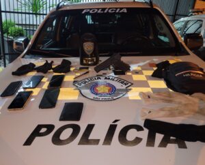 Houve um breve acompanhamento e, em seguida, a abordagem. Três dos quatro ocupantes possuíam antecedentes criminais e em poder da quadrilha havia meias e luvas com estilhaços de vidros possivelmente de veículos, um objeto pontiagudo para quebra de vidros, além de uma réplica de pistola e um cartão bancário.