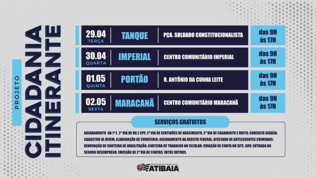 A unidade móvel do projeto “Cidadania Itinerante” está em Atibaia desde o último dia 29 realizando atendimentos como atualização de documentos, orientações jurídicas, entre outros serviços. A iniciativa é da Secretaria Estadual de Justiça e Cidadania, em parceria com a Prefeitura de Atibaia.