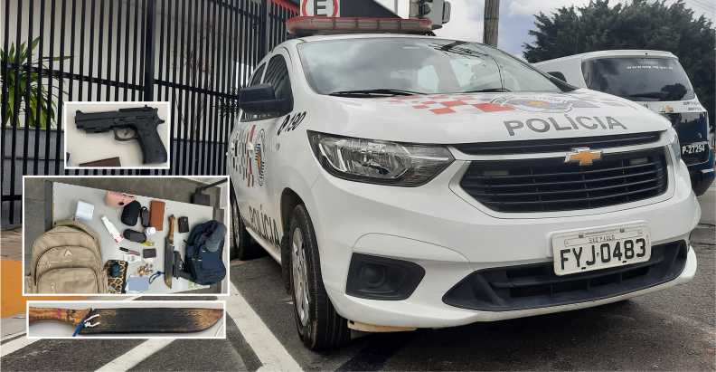 Realizada diligência na casa dele, foram localizados outros objetos do roubo, uma réplica de arma de fogo, um facão e a mochila utilizada no crime.