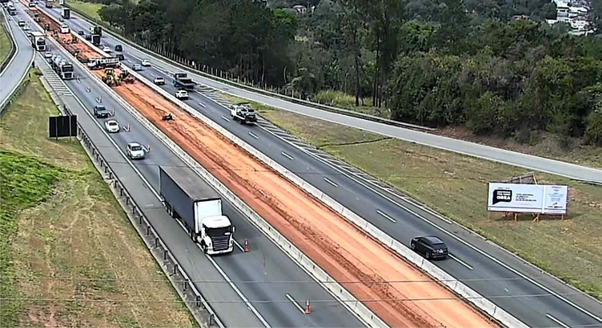 As obras da faixa adicional da rodovia Dom Pedro I, em Atibaia, interditam faixa na pista Norte, sentido Campinas.