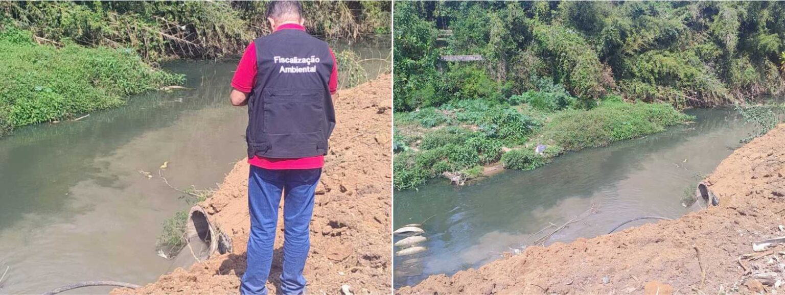 Durante a vistoria, a equipe da Fiscalização Ambiental constatou que um cano lançava, de forma contínua, esgoto diretamente no Ribeirão Lavapés. O despejo irregular foi caracterizado como grave incidente de poluição hídrica, exigindo medidas imediatas.