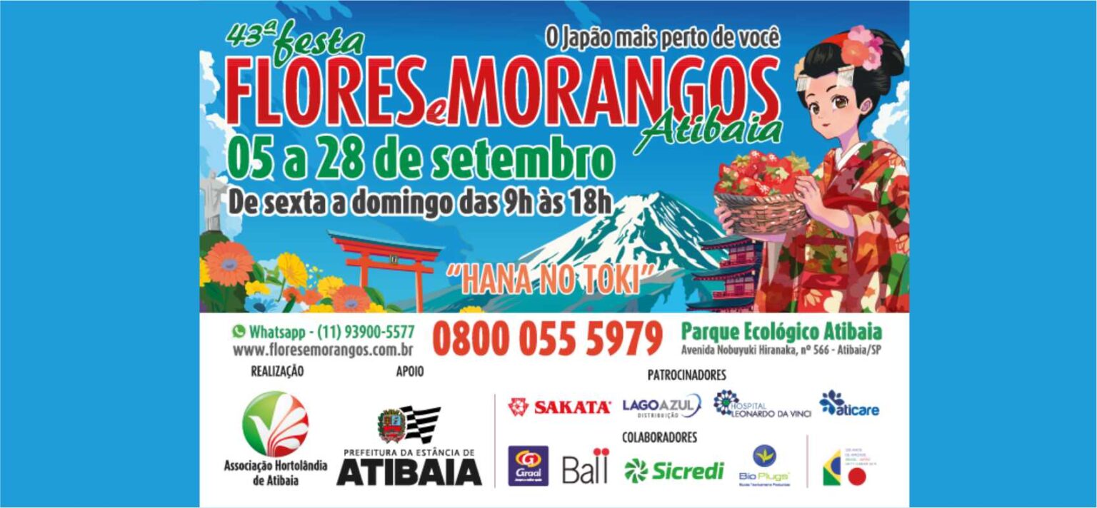 Com a presença de diversas autoridades locais, estaduais e nacionais, a 43ª Festa de Flores e Morangos de Atibaia começa nesta sexta-feira, dia 5 de setembro, com a cerimônia de abertura, a partir das 10h, no Parque Ecológico. A edição deste ano reúne diversas novidades para encantar ainda mais seus visitantes, como a exposição fotográfica dos 130 anos dos Tratados de Amizade, Comércio e Navegação entre Brasil e Japão; Monumento Permanente das Gerações Japonesas; Ninja Jiraiya; Concurso de Cosplay; ações educativas socioambientais do IPÊ; sem falar do pavilhão de exposição de flores, venda de morangos e diversas atrações culturais.