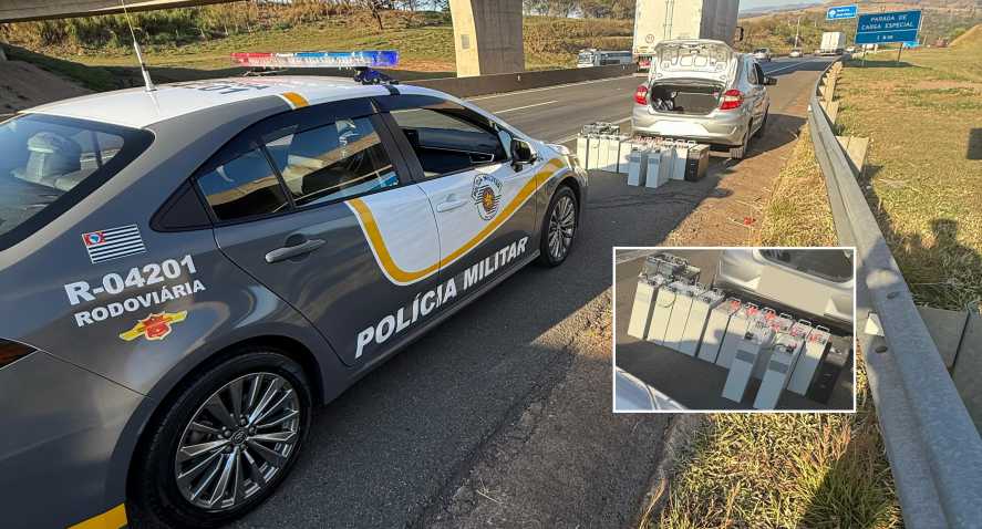 Dentro do carro havia 16 baterias de lítio, utilizadas em torres de telefonia, além de maquinário para extração das mesmas. A dupla, sem uniforme, nota fiscal ou ordem de serviço para o transporte das baterias, caiu em contradições ao apresentar itinerários divergentes quando a procedência do material.