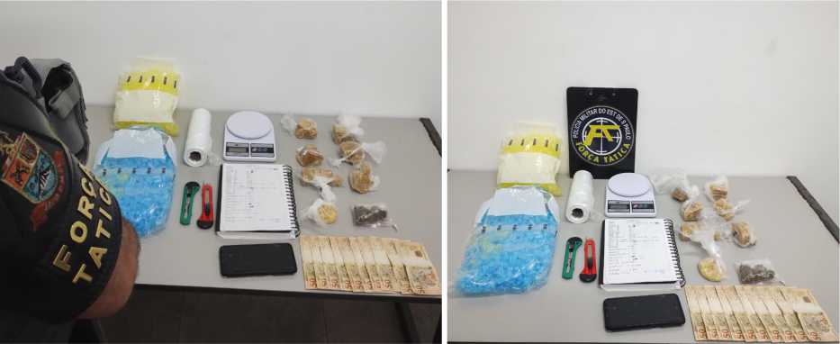 As Equipes Comando e de Força Tática se locomoveram até o endereço informado e, na busca residencial devidamente autorizada e acompanhada, os policiais localizaram drogas prontas para a venda, caderno com anotações, balança de precisão, além de petrechos para o comércio e embalo dos entorpecentes.