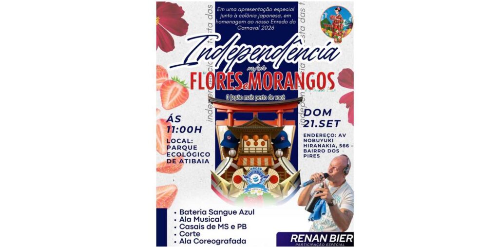 A Escola de Samba Independência de Atibaia fará uma apresentação especial, neste domingo (21), a partir das 11h, na 43ª Festa de Flores e Morangos de Atibaia, em homenagem à Colônia Japonesa do Município, tema do enredo da escola para o Carnaval 2026: ‘‘Banzai: Da Terra do Sol Nascente, Uma Herança, Um Povo, Nossa Gente’’.