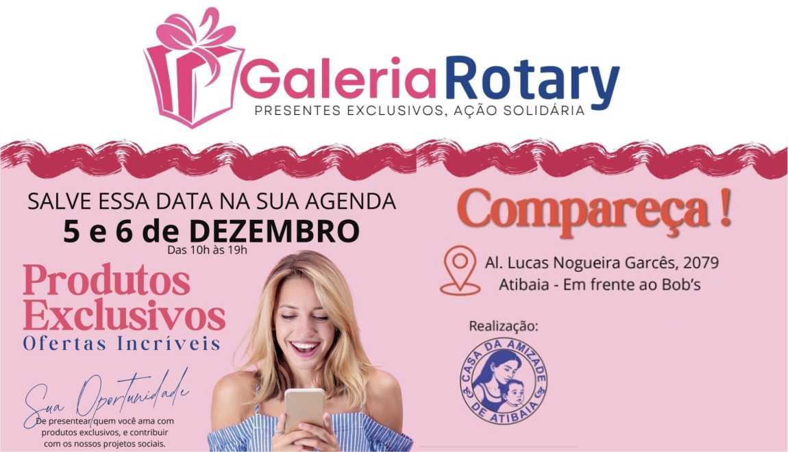E, agora, elas estão te convidando para algo especial: a GALERIA ROTARY. Dias 5 e 6 de dezembro na alameda Lucas Nogueira Garcês, 2079, em Atibaia.