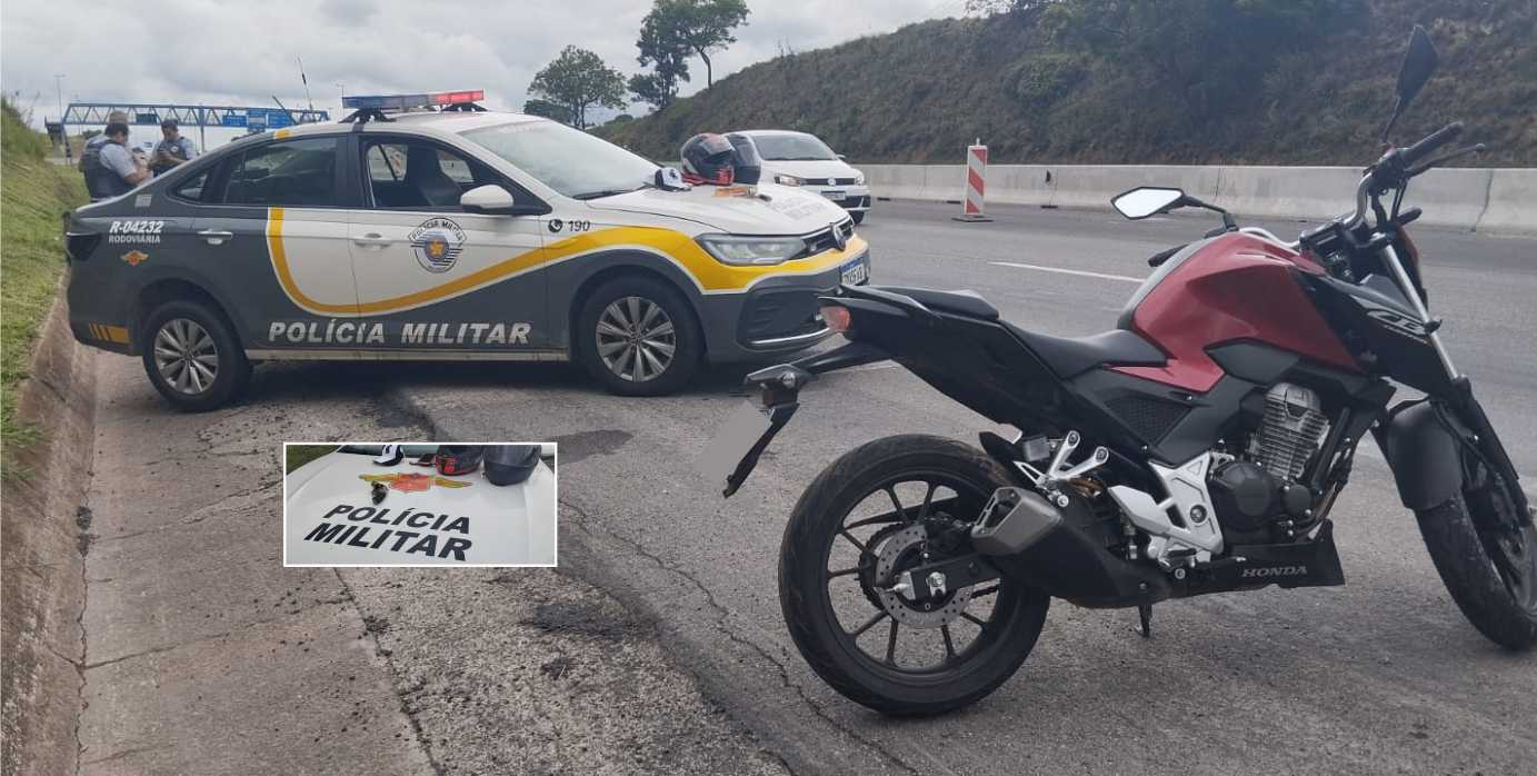 Durante a vistoria veicular, os policiais constataram que a placa de identificação estava adulterada com fita isolante. O homem recebeu voz de prisão por roubo, porte ilegal de arma de fogo e adulteração de sinal identificador veicular, e foi conduzido ao Plantão Policial de Atibaia, permanecendo à disposição da Justiça. A moto foi apreendida.