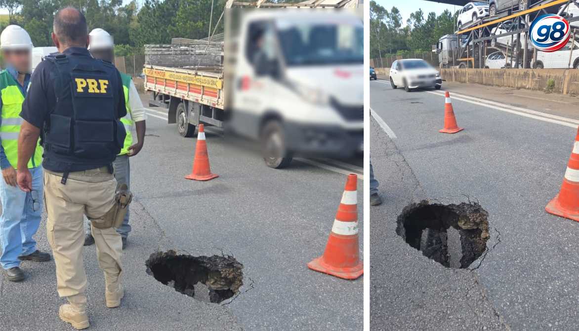 Foi identificado um buraco no local. A Polícia Rodoviária Federal e técnicos da Arteris avaliam nesse momento a situação a ser tomada.