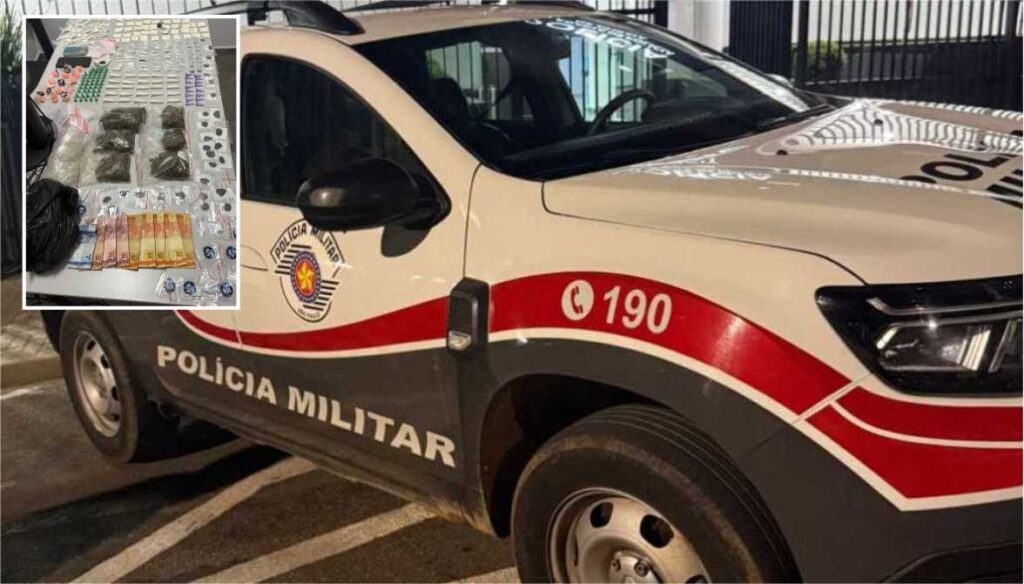 Ao recuperarem a sacola dispensada, os policiais encontraram uma grande quantidade de drogas, incluindo porções de cocaína de diferentes tipos, crack, maconha e substância conhecida como “Dry”, além de uma balança de precisão e materiais utilizados para embalagem.